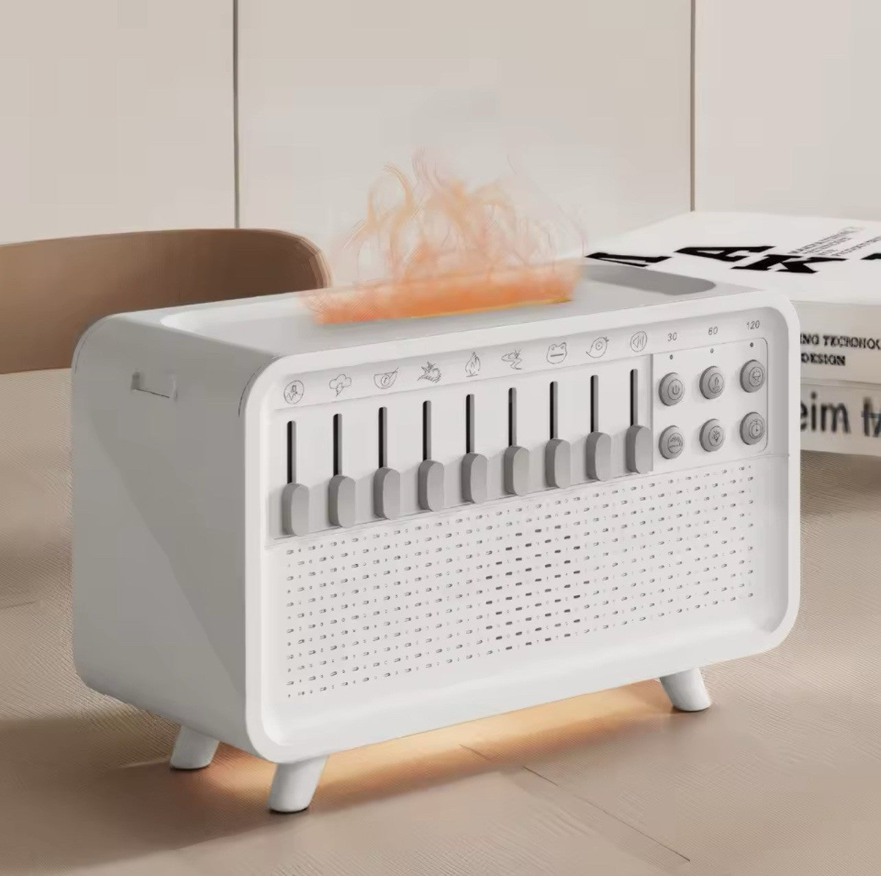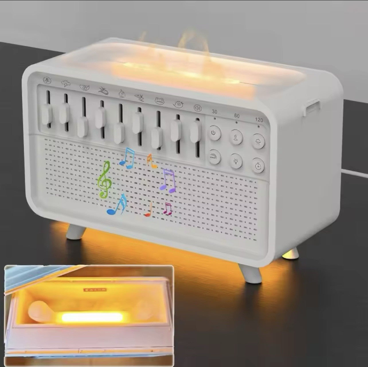 • ✨ 4-in-1 Multifunctional Design – Humidifier, aromatherapy diffuser, white noise sleep machine, and Bluetooth speaker with warm flame-style LED night light.