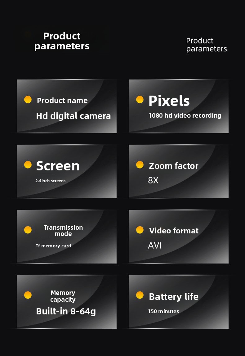 - Sensor type: CCDSensor size: 1/1.7 inchEffective pixels: 5000WOptical zoom: 8xDigital zoom: 8xMax resolution: 1280�1024Screen size: 2.3-inch HD displayLens type: PeriscopeImage stabilization: ElectronicStorage: Supports TF card (no internal memory)Material: ABS + hardwareWeight: 250gBody colors: Black, White, Brown, Pink