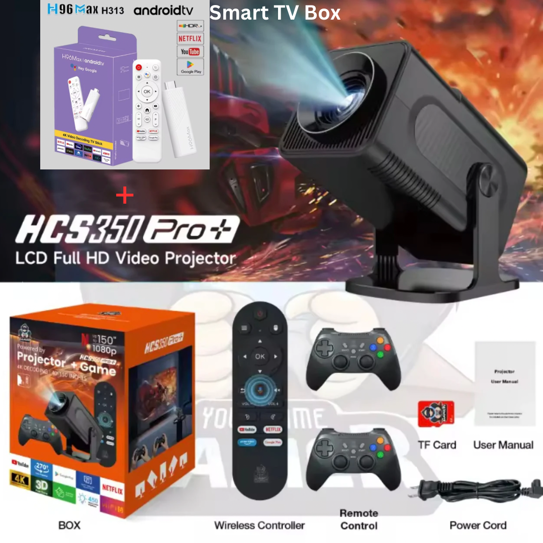 Meet the upgraded HCS350 Pro+, featuring everything you love about the Pro — plus a voice-enabled remote and enhanced game controllers for effortless control. Stream, mirror, or play your favorite retro titles in stunning HD 1080P with 4K decoding, project up to 100 inches, and dual-band WiFi 6. Sleek, smart, and powerful — your entertainment at the sound of your voice.