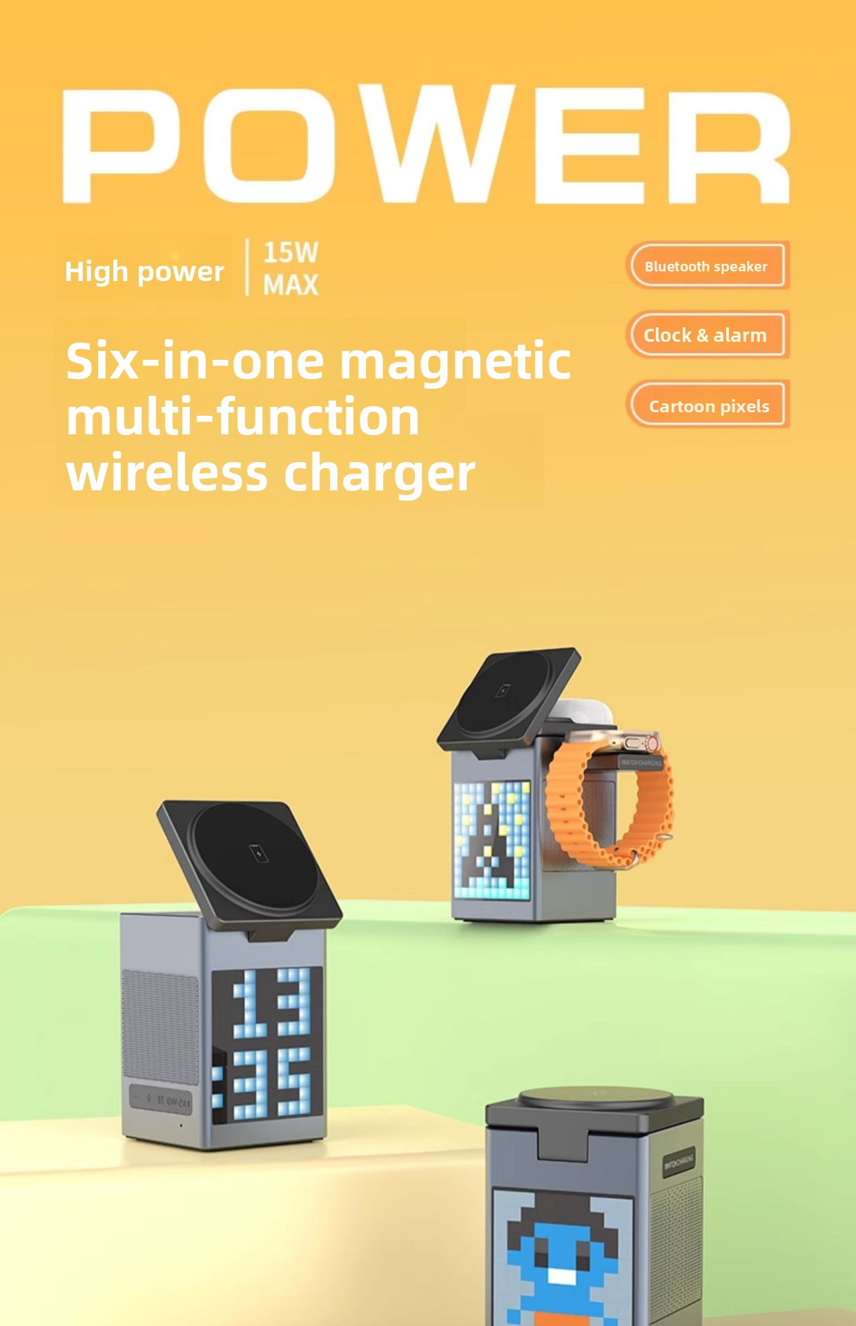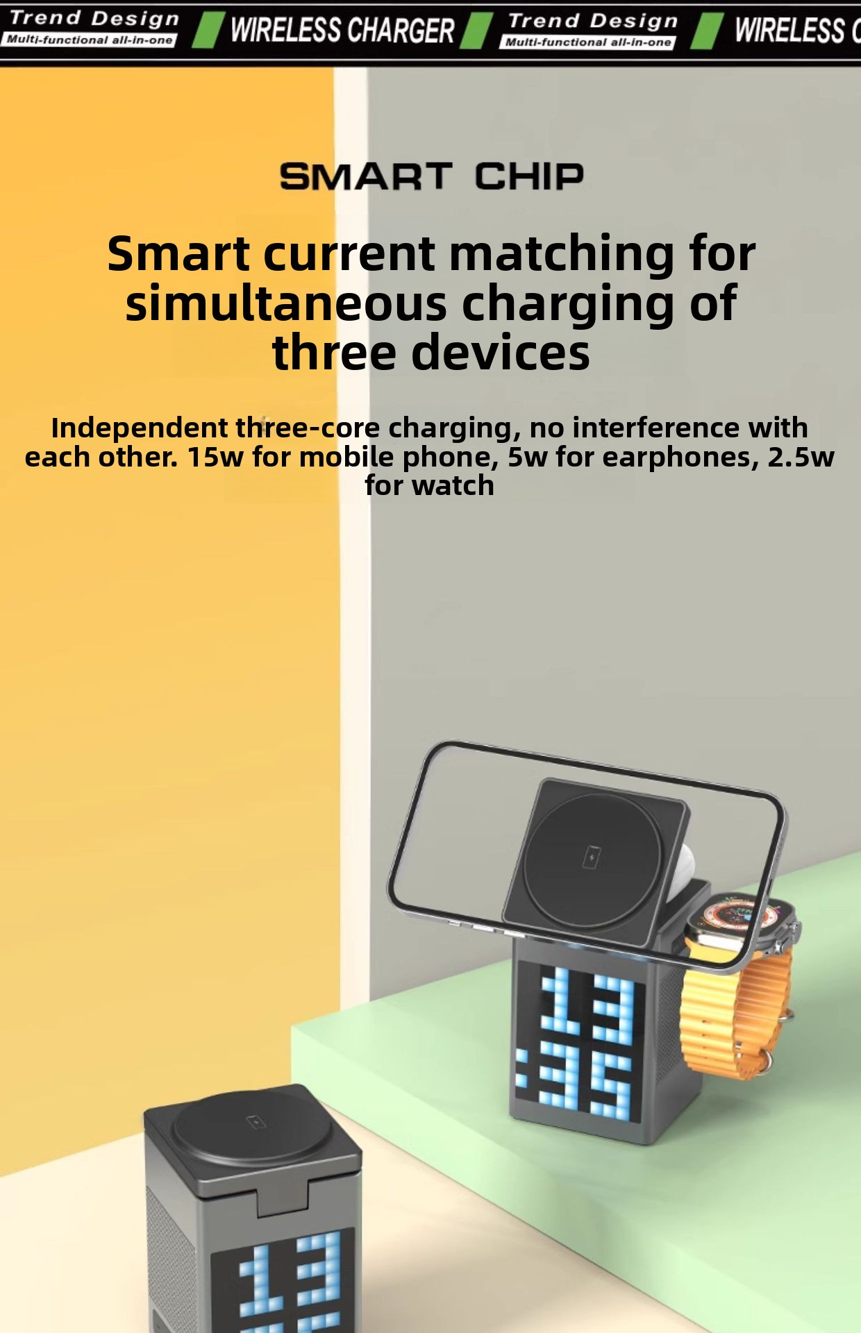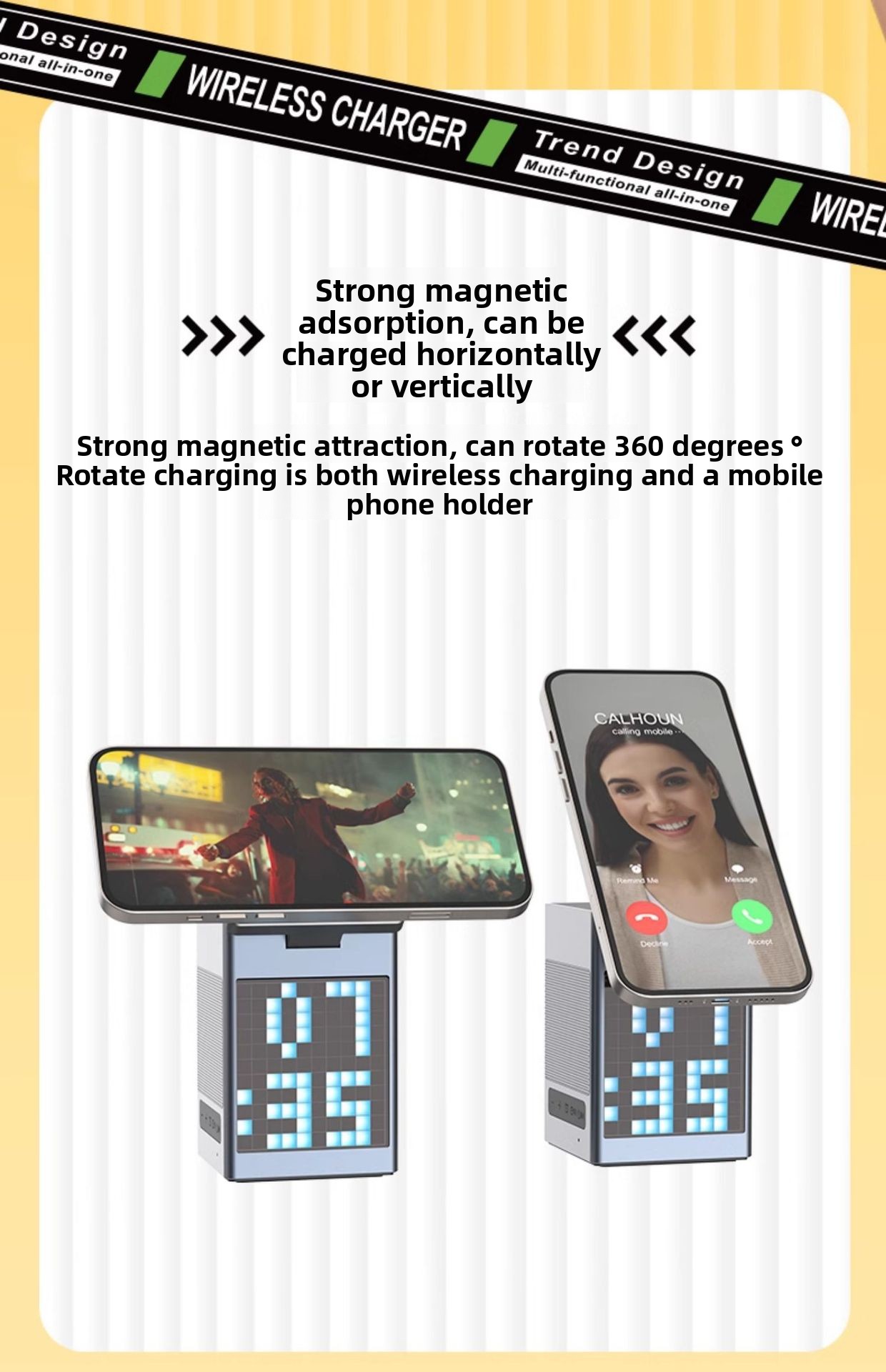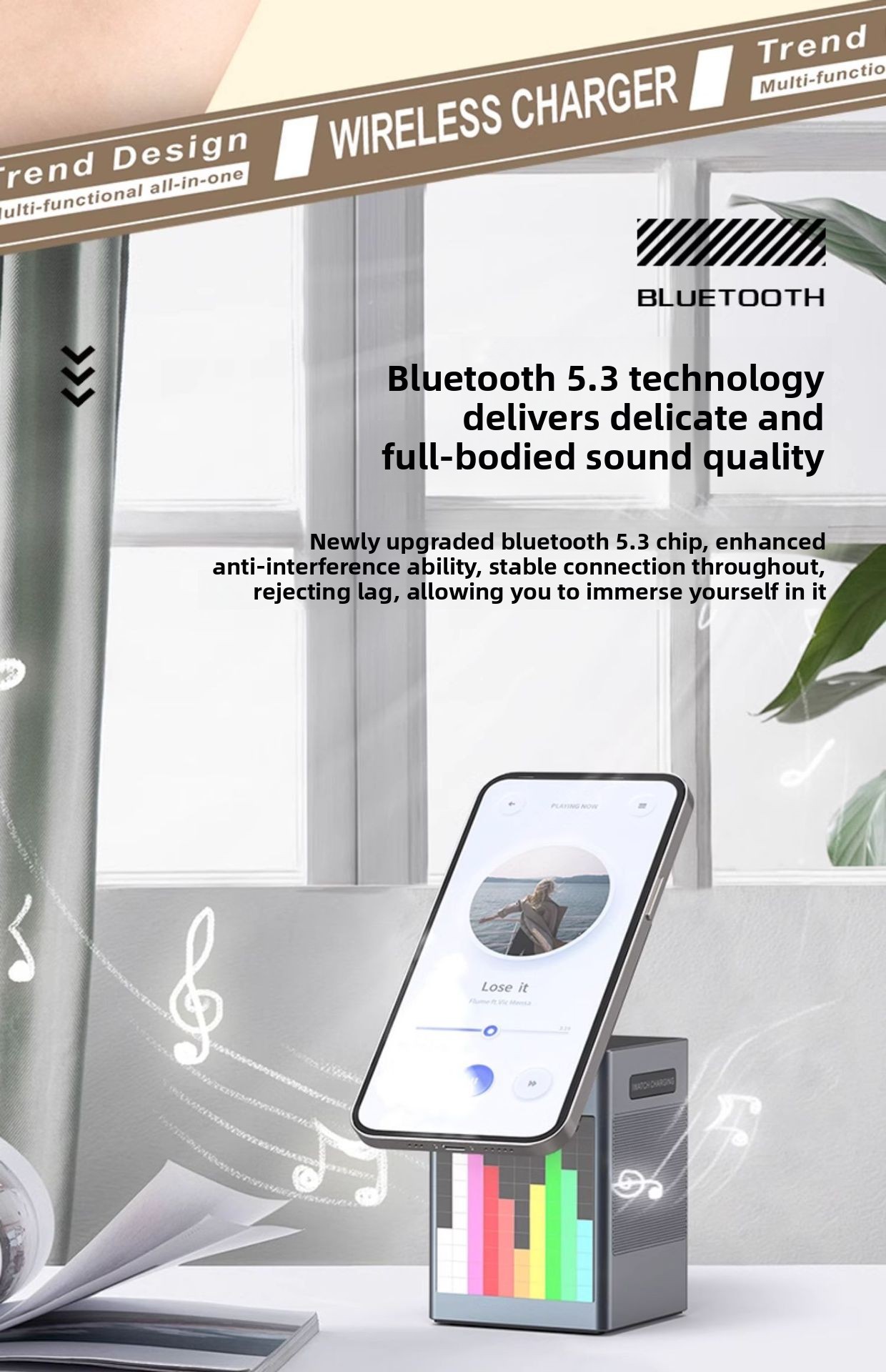 Multi-functional Design: Combines Bluetooth audio, wireless charging, and magnetic phone holder in one device, High Power Output: Total power of 30W and output power of 22.5W, Versatile Compatibility: Suitable for phones, headphones, and watches
