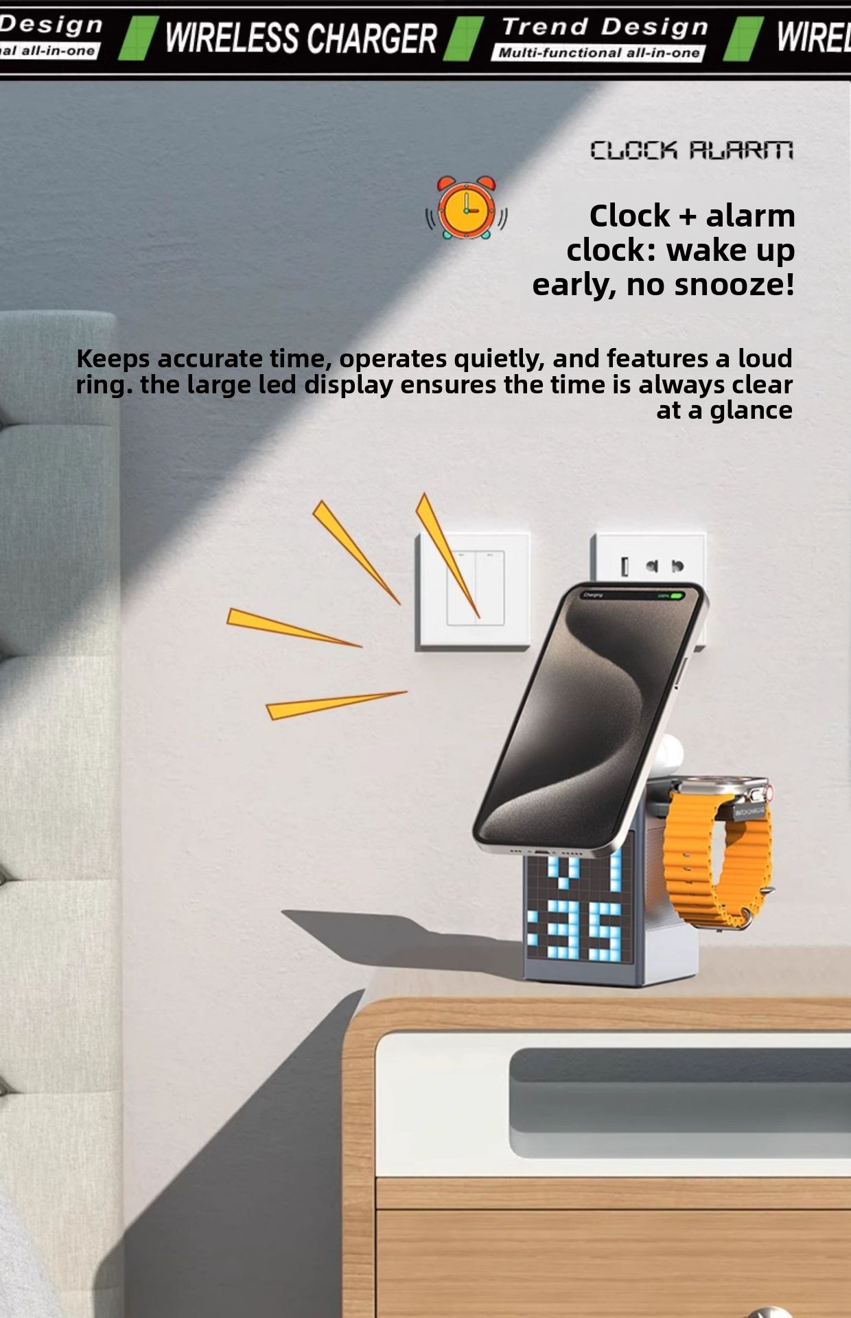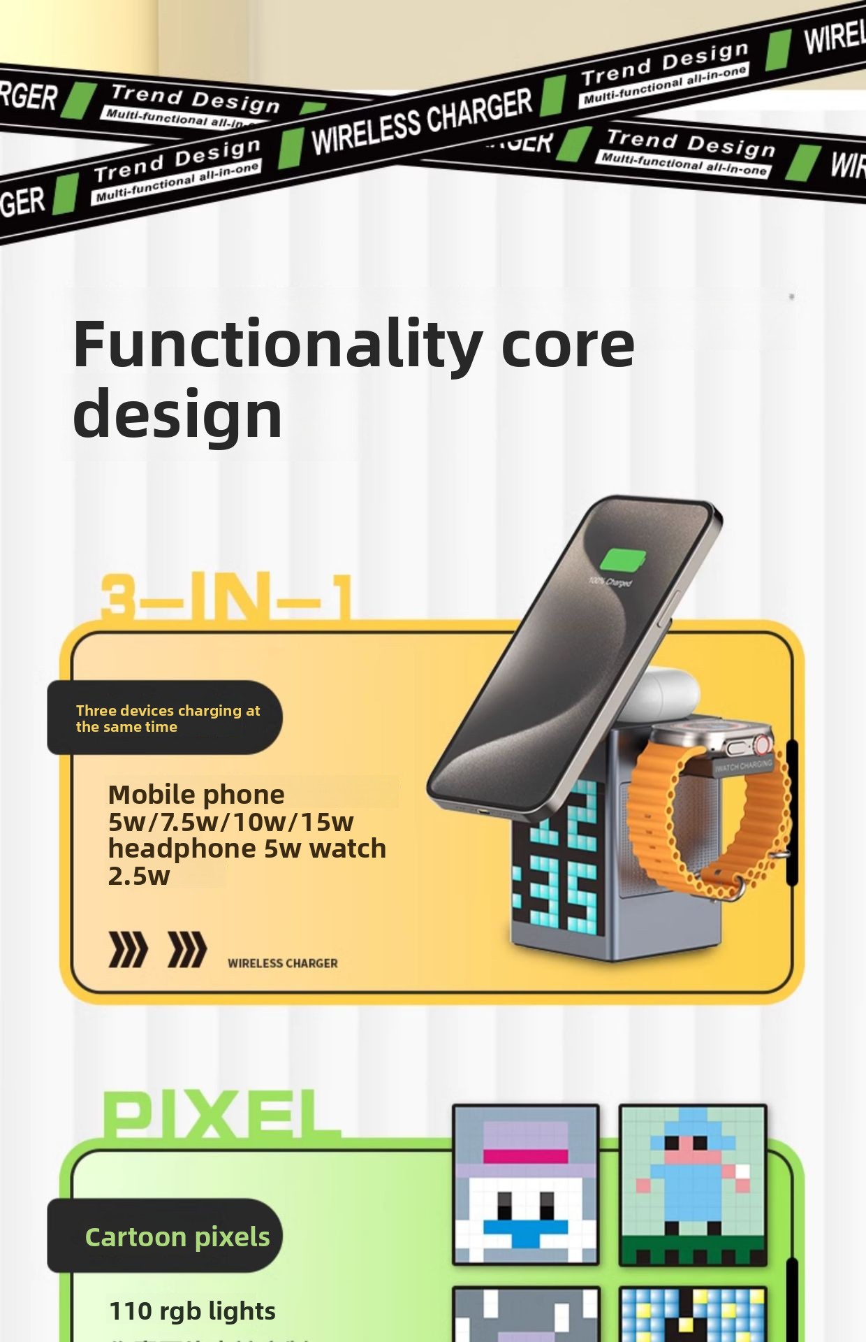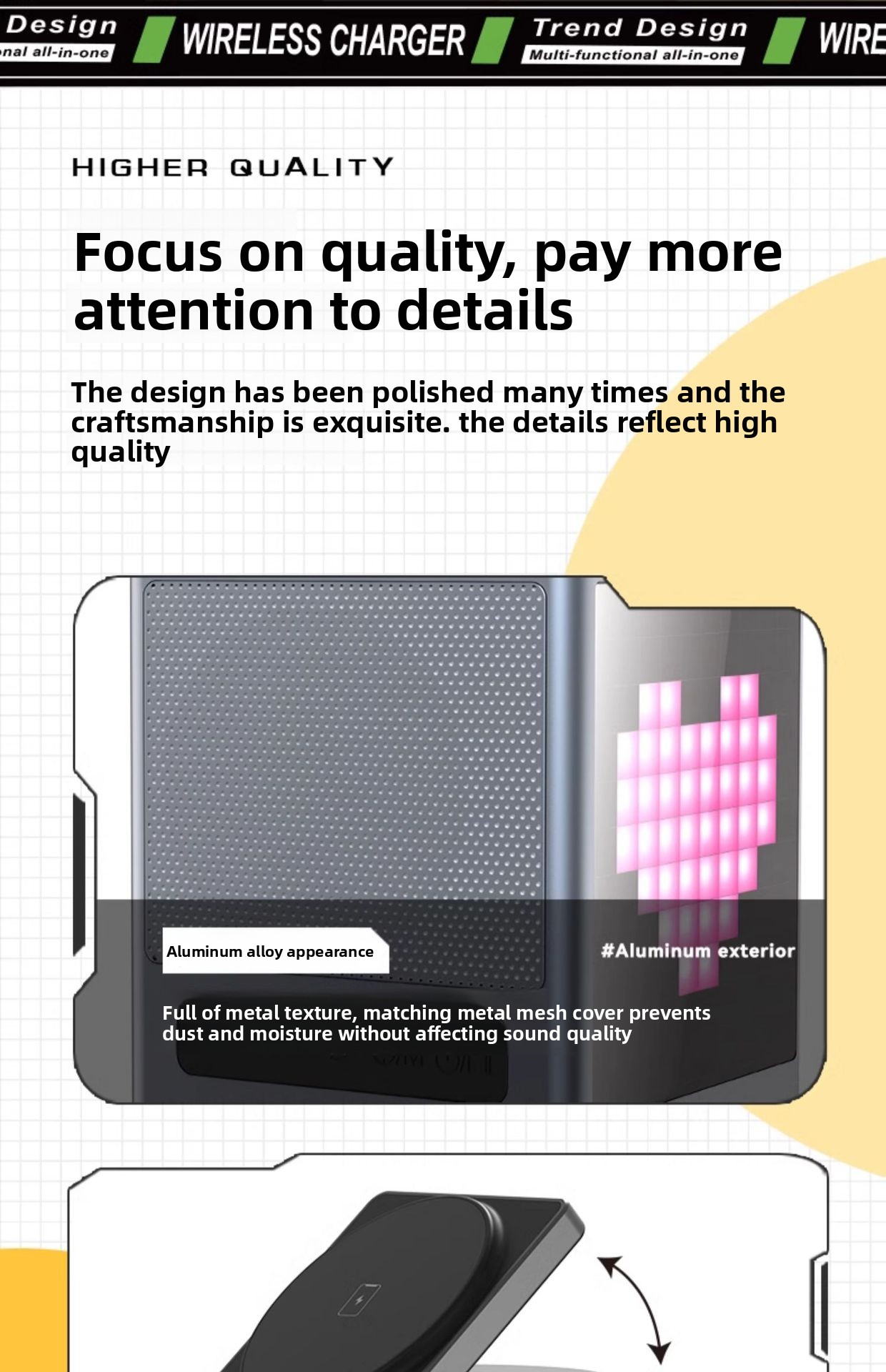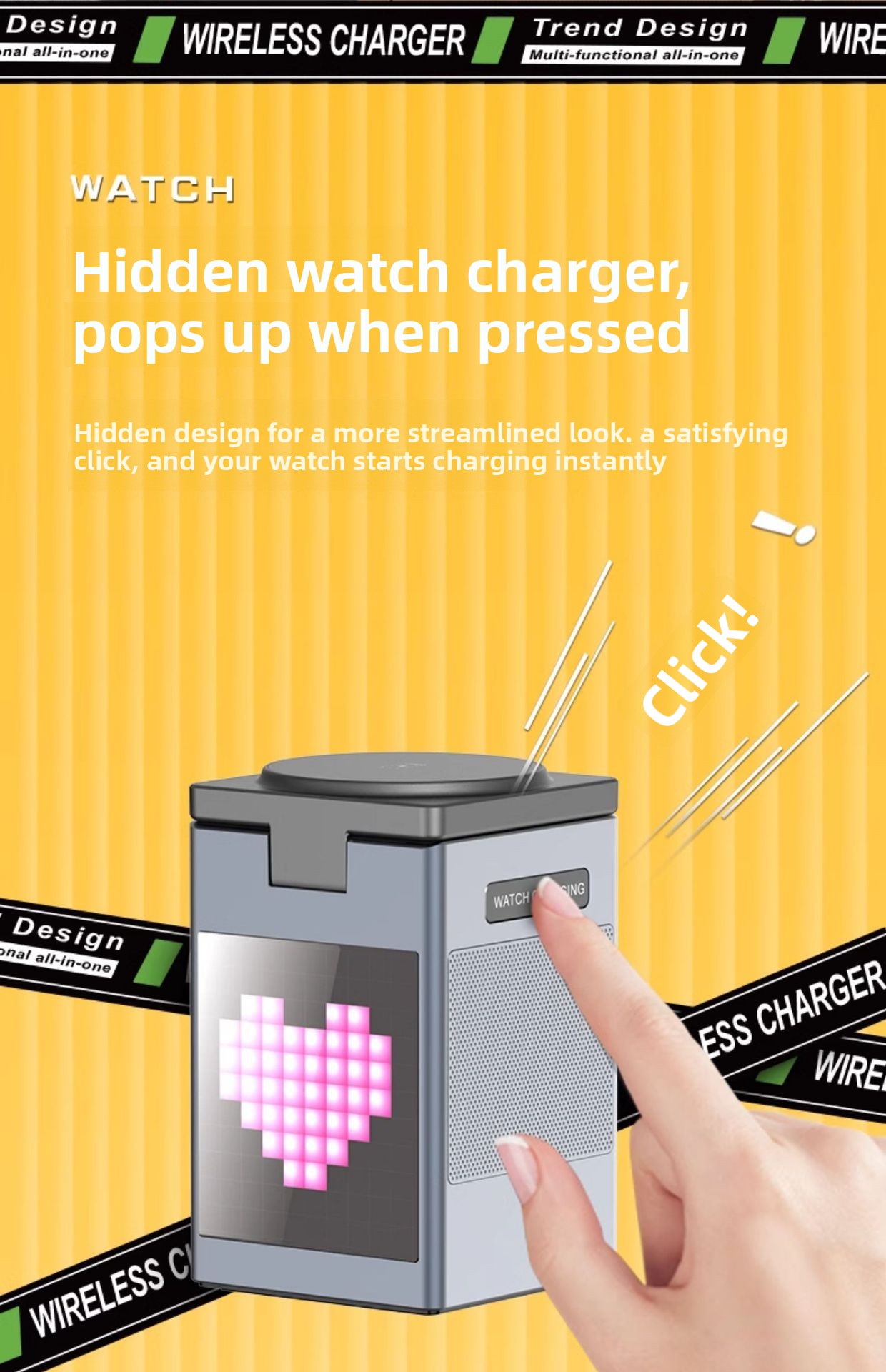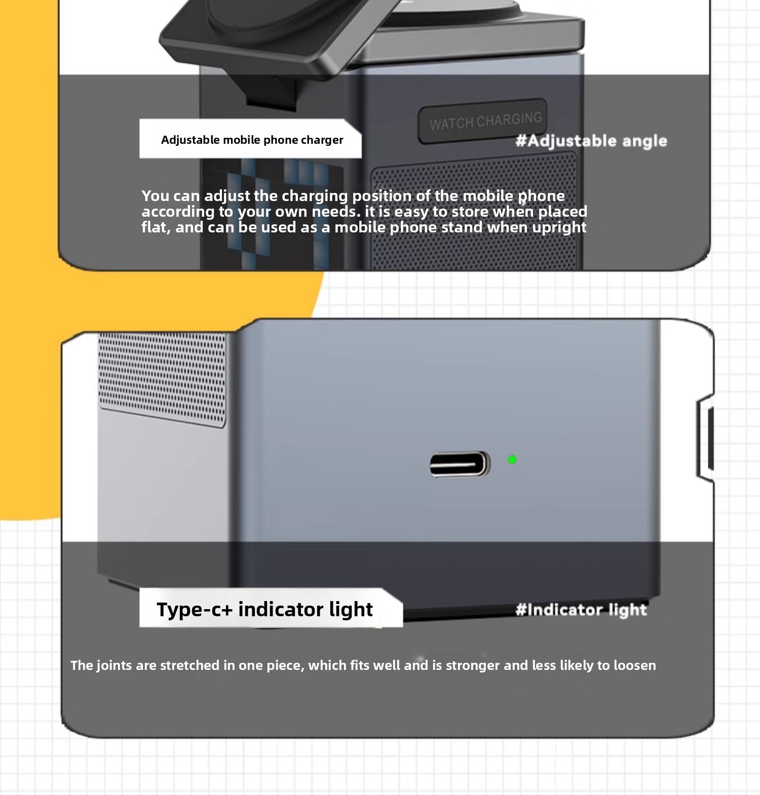 Multi-functional Design: Combines Bluetooth audio, wireless charging, and magnetic phone holder in one device, High Power Output: Total power of 30W and output power of 22.5W, Versatile Compatibility: Suitable for phones, headphones, and watches