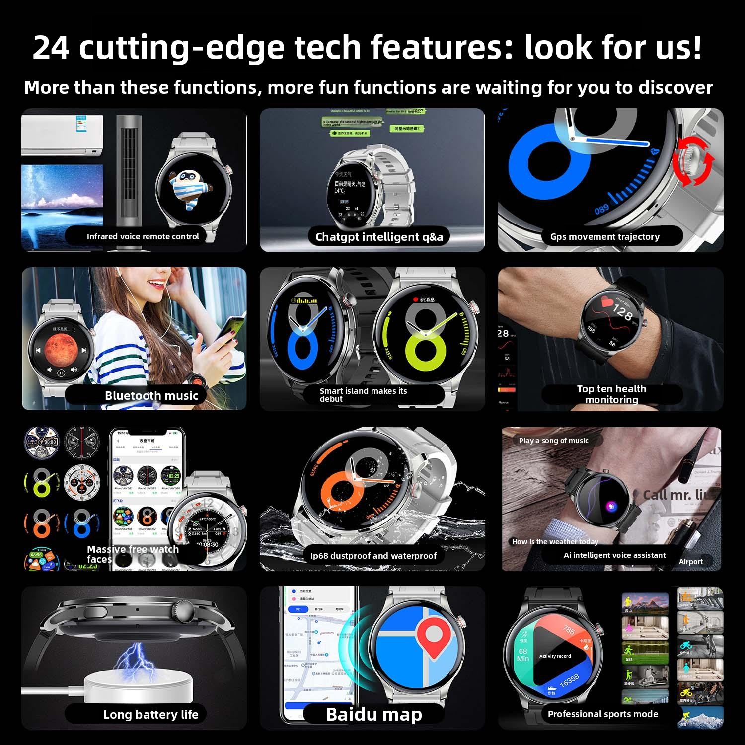 Functions: Heart rate monitoring, step counting, Bluetooth calls, NFC, GPS, infrared remote.