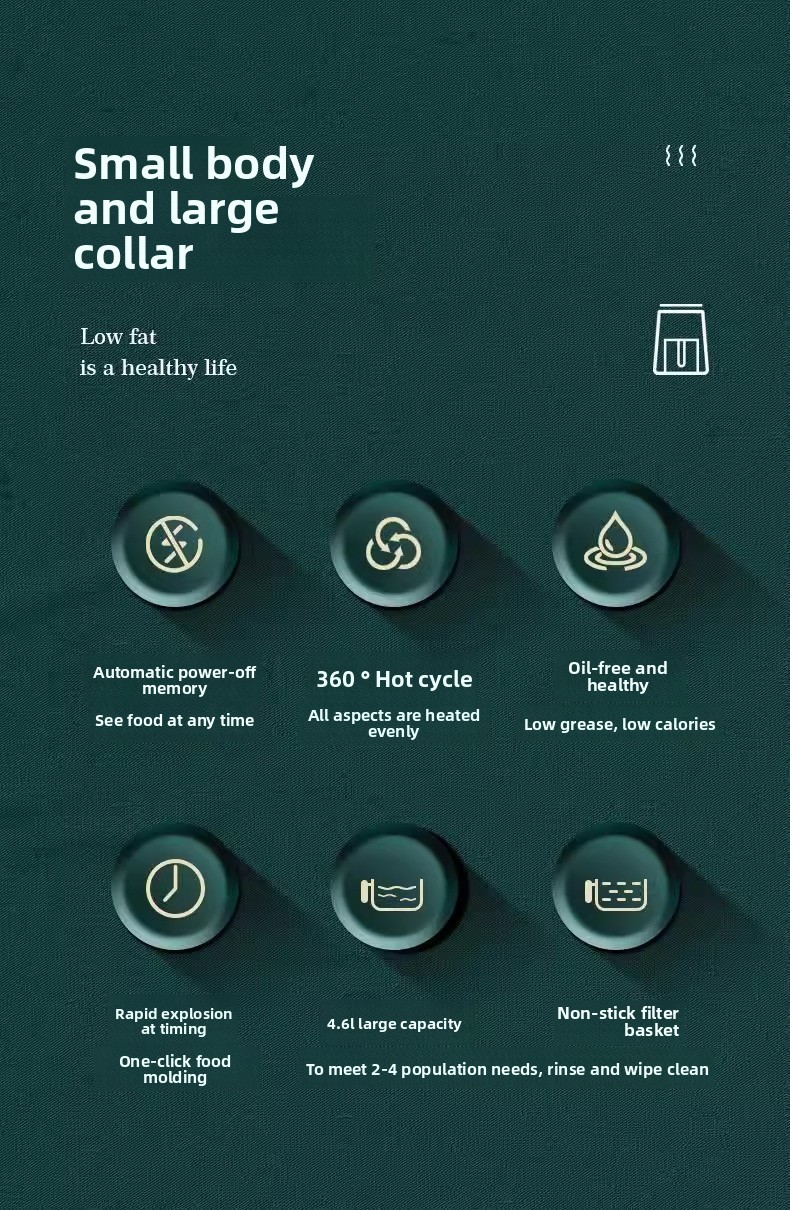 Oil-Free Cooking: Utilizes hot air convection for healthier frying.