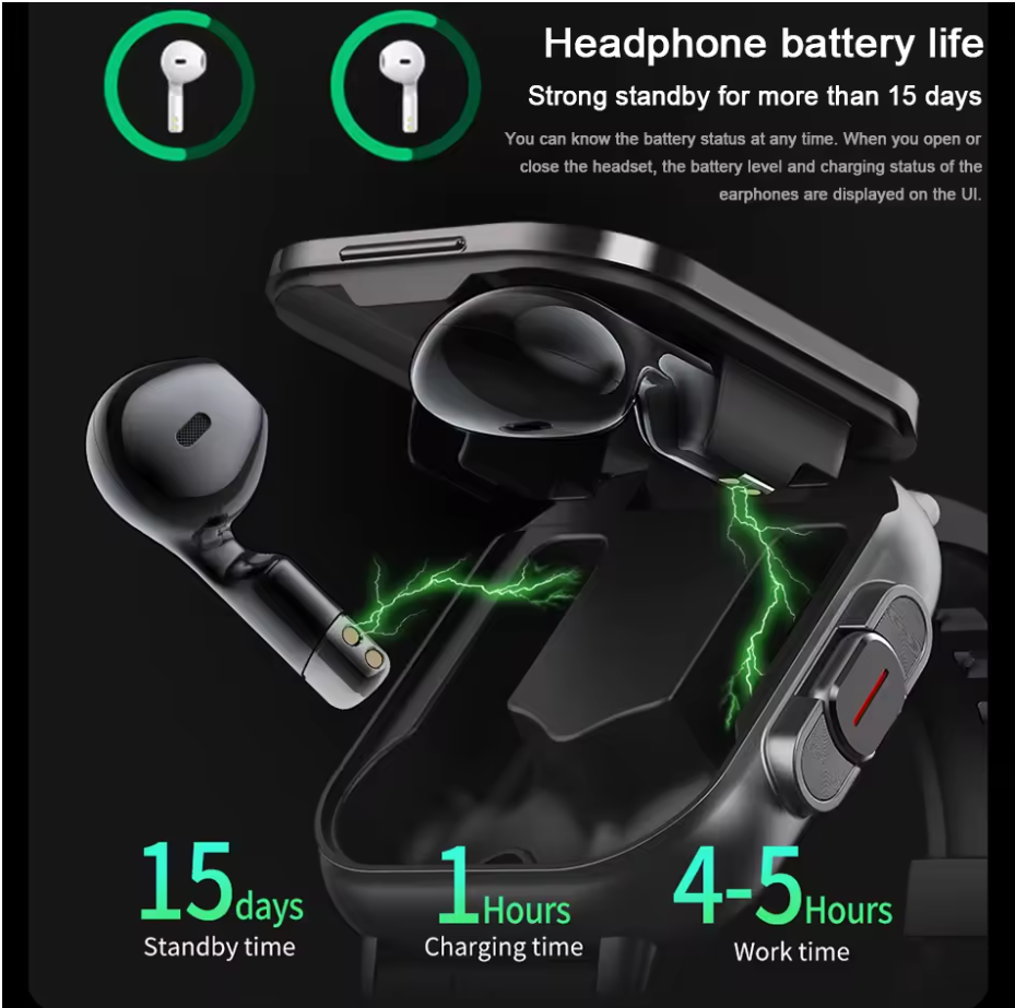 he ultimate fusion of style, fitness, and entertainment – a smartwatch that doubles as a wireless earphone set. Stay connected, monitor your health, and enjoy music anywhere, all from your wrist.