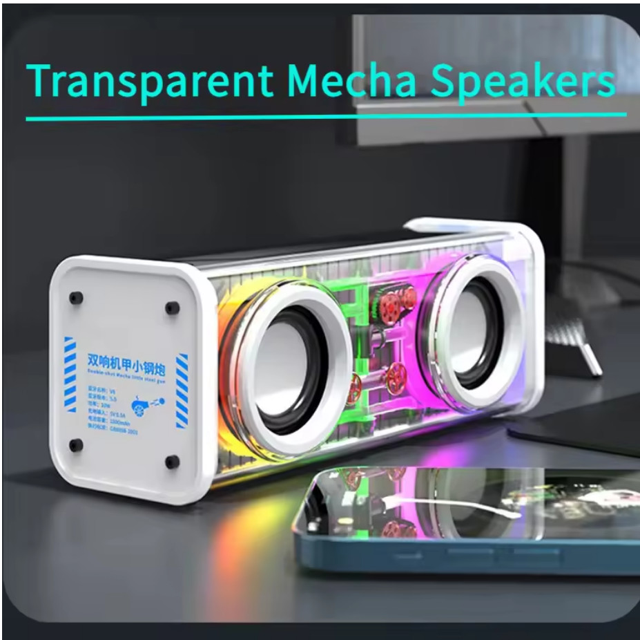 Transparent Mecha Bluetooth 5.0 TWS Speakers – Wireless Mini Party Loudspeaker with Double Bass Diaphragm & RGB Lights