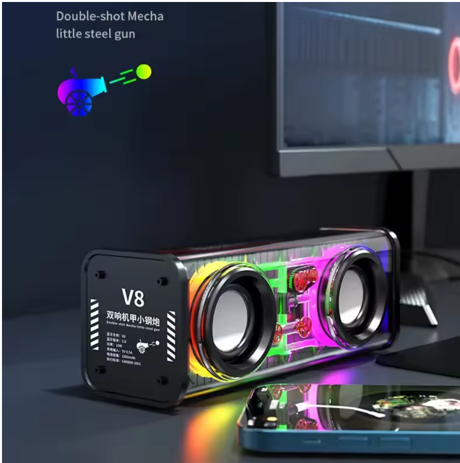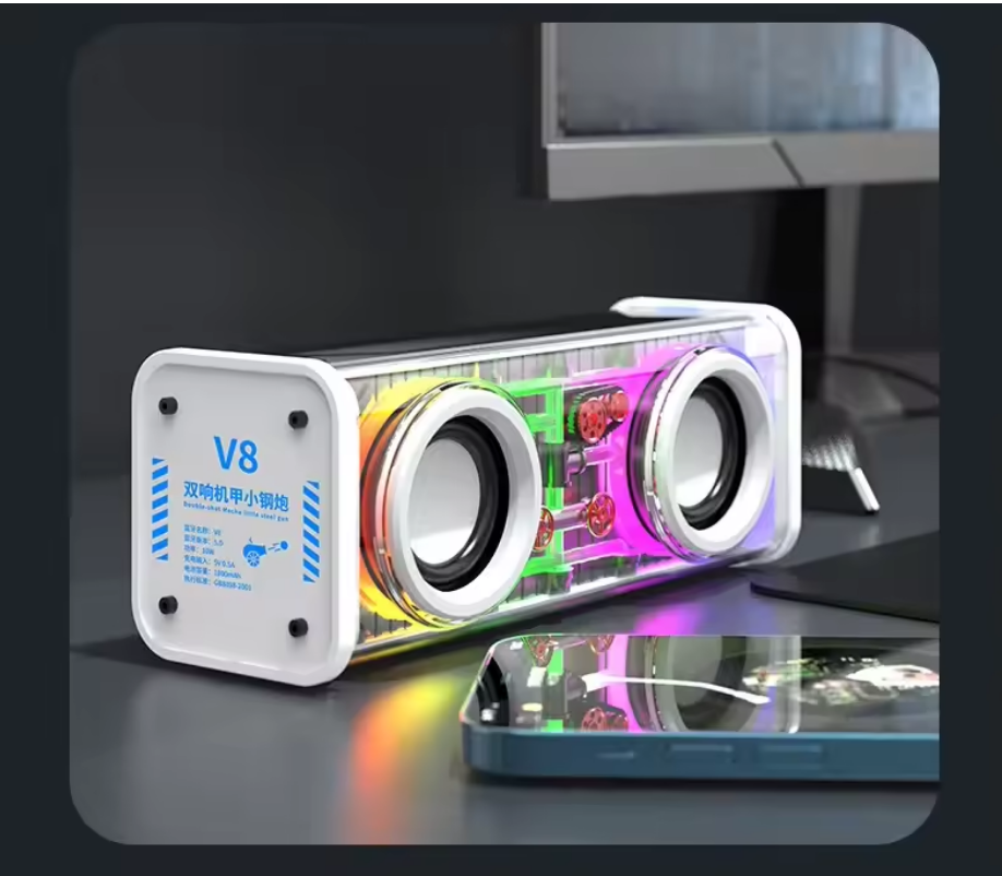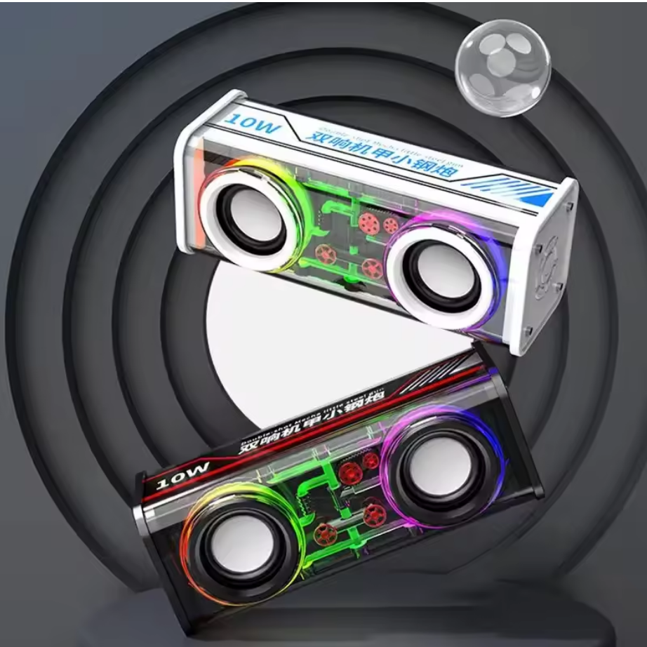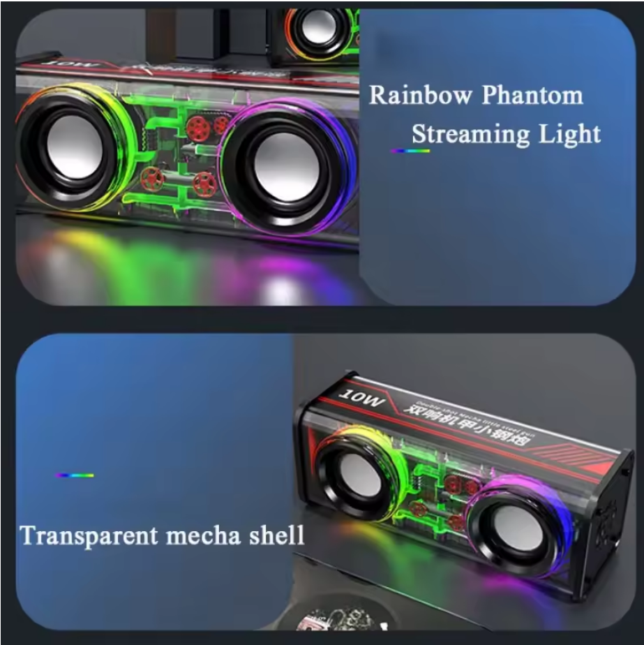 Perfect for mini parties, home entertainment, outdoor adventures, or gaming setups, the Transparent Mecha Speaker combines powerful sound, stylish design, and fun RGB lighting for a complete audio-visual experience.