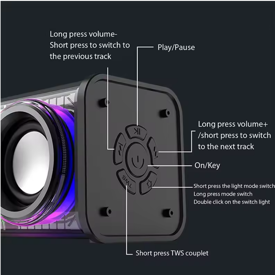 Bring your music to life with the Transparent Mecha TWS Speaker, designed for immersive sound and a visually striking party experience. Compact yet powerful, this wireless mini speaker combines dual bass diaphragm, RGB lights, and Bluetooth 5.0 connectivity for clear, rich audio wherever you go.